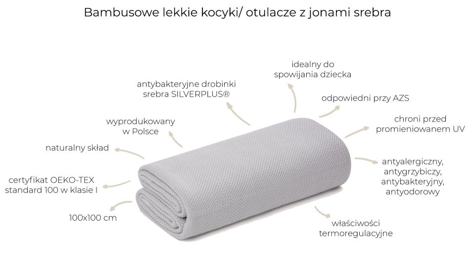 Całoroczny, miękki i oddychający dziany kocyk w minimalistycznym, skandynawskim stylu. Dziany w całości w Polsce z certyfikowanej przędzy bambusowej wzbogacony o jony srebra. Idealny dla delikatnej skóry dziecka- pochłania wilgoć i utrzymuje ją z daleka od skóry, posiada właściwości termoregulacyjne- utrzymuje komfort cieplny, zapobiega przegrzewaniu. Chroni przed promieniami UV.