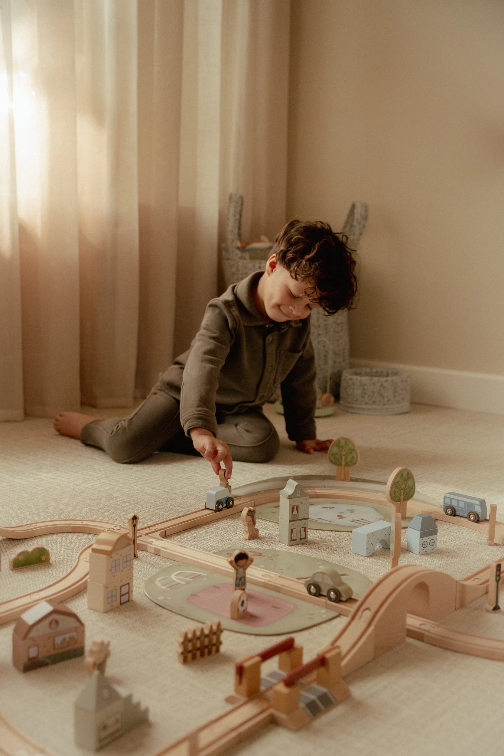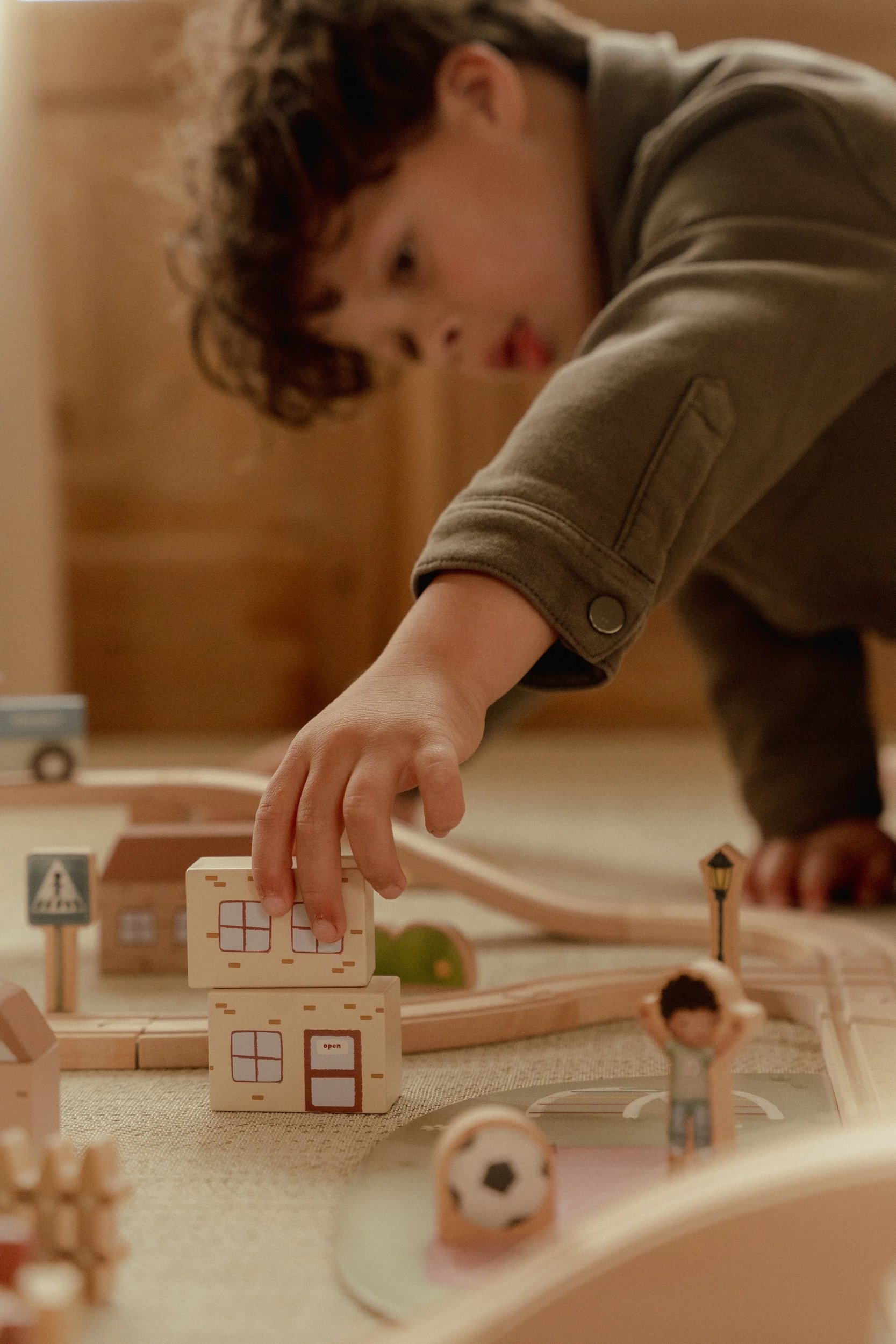 Zestaw składający się z ponad 100 drewnianych elementów daje wiele możliwości na kreatywne budowanie tras i miasteczek – za każdym razem coś nowego! Każdy element jest starannie wykonany z drewna z certyfikatem FSC (Forest Stewardship Council). Do zestawu dużej kolejki można skompletować dodatkowe drewniane zestawy zawierające: remizę strażacką, posterunek policji czy dodatkowe wagoniki. Zapakowany w ładny karton, idealny na prezent, zarówno dla dziewczynki, jak i dla chłopca.