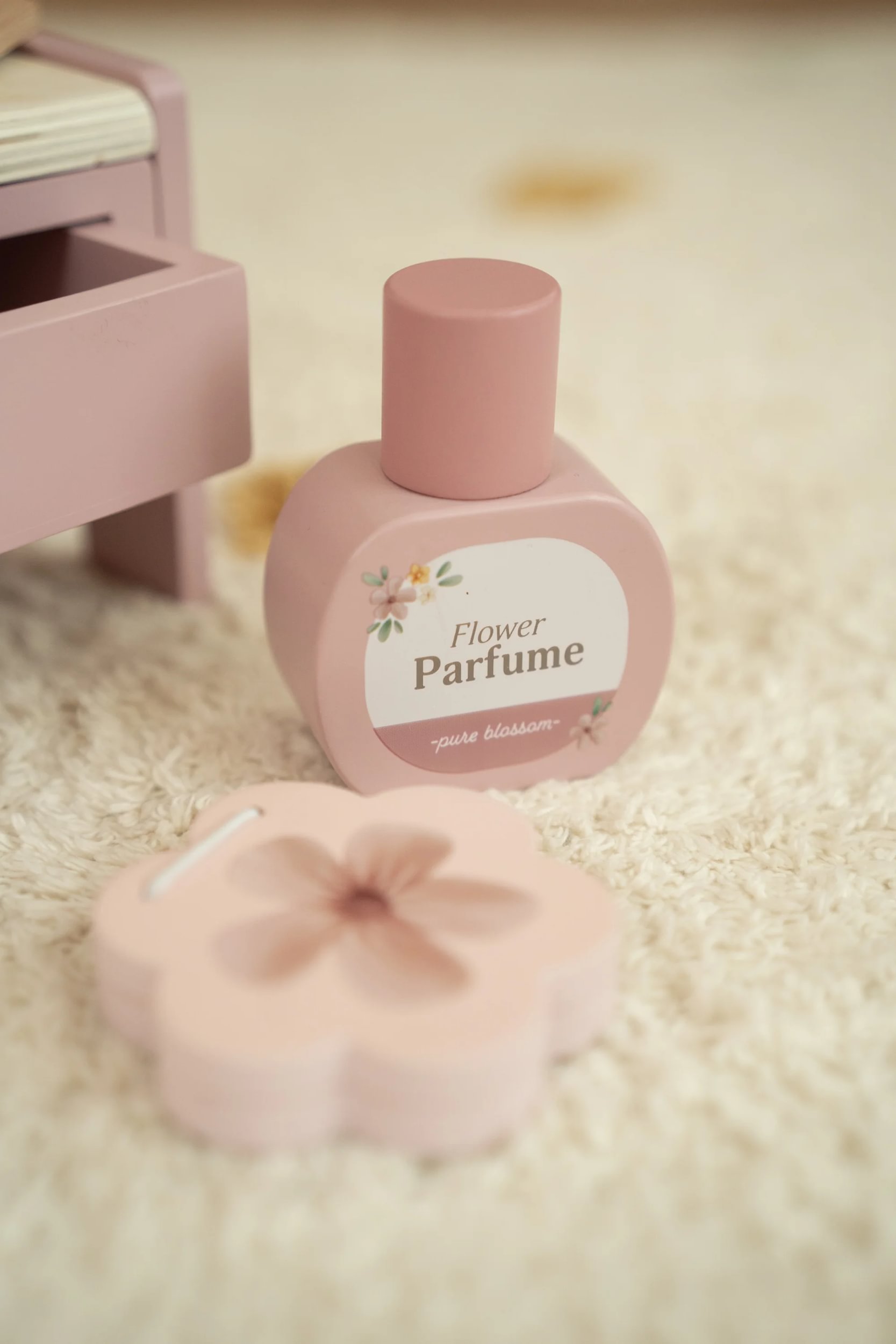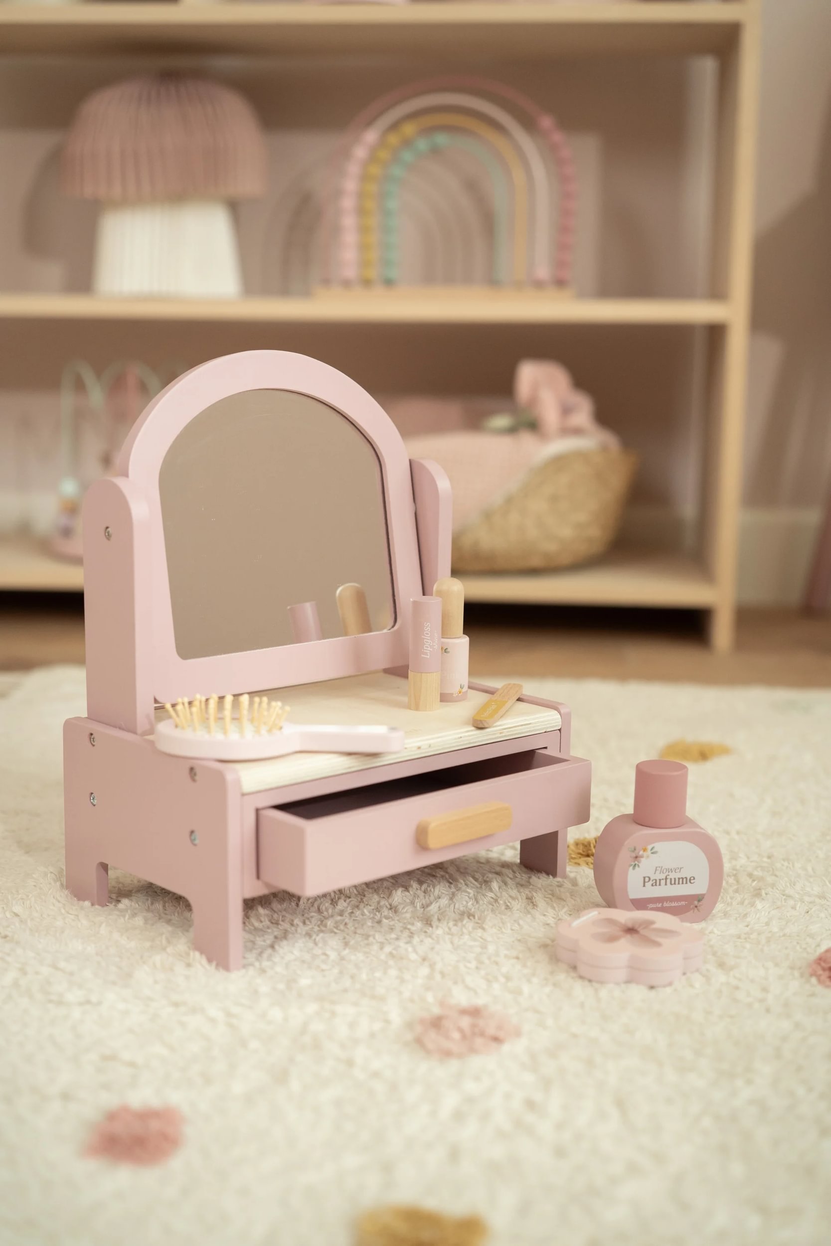 Drewniana toaletka od Little Dutch. Piękna różowa drewniana toaletka dla dzieci, zachęca do pomysłowej i niekończącej się zabawy. W toaletce znajduje się obrotowe lustro oraz 6 drewnianych kosmetyków, takich jak szczotka do włosów, szminka, flakonik perfum, cień do powiek, pilnik do paznokci i lakier do paznokci. Toaletka posiada również szufladę do przechowywania skarbów. Każda dziewczynka będzie zachwycona! Pięknie wykonana z wysokiej jakości drewna FSC.
