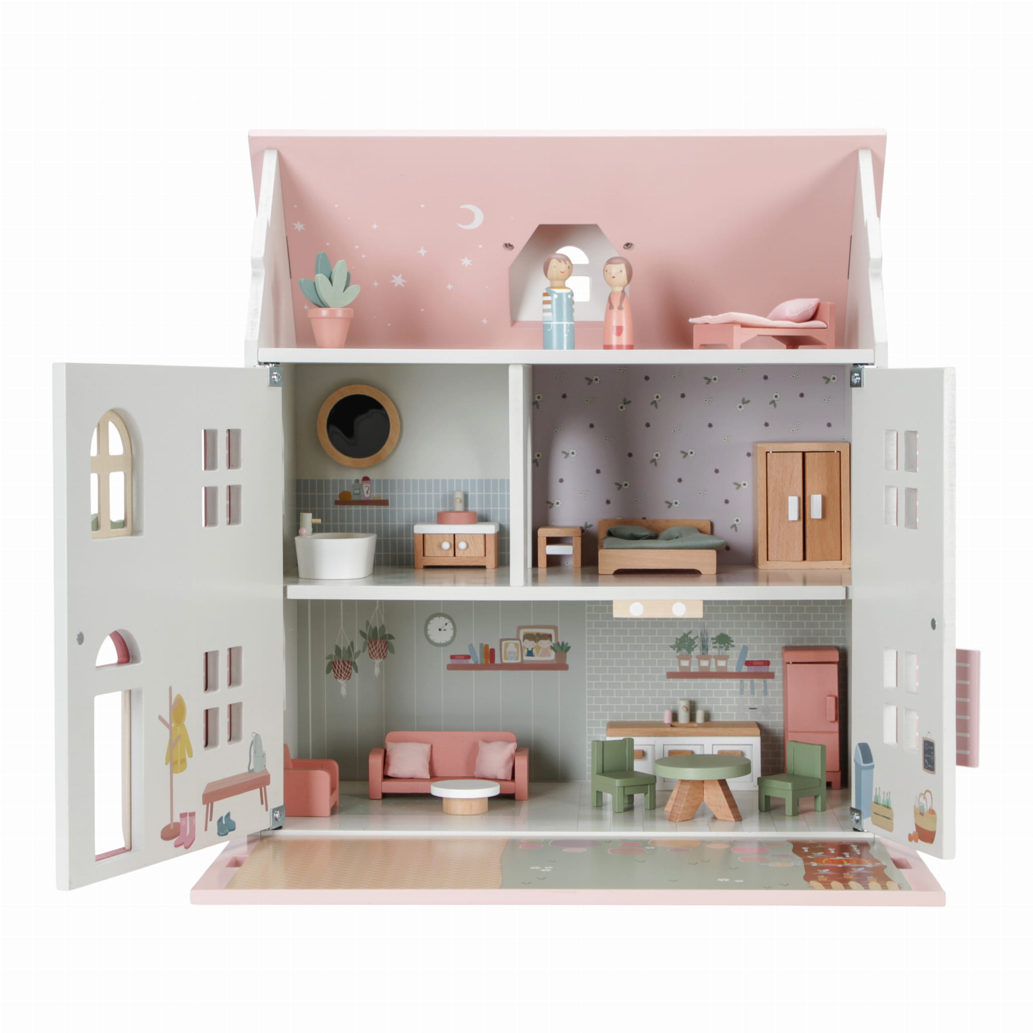 Duży domek dla lalek FSC od Little Dutch to idealne miejsce, w którym dzieci mogą uwolnić swoją kreatywność. Ten piękny domek z różowym dachem i ma drewniane okiennice, które można otwierać i zamykać. Dach można również otworzyć, aby zapewnić łatwiejszy dostęp do wnętrza domku, a część dachu można przekształcić w ogród. Wnętrze domu jest bardzo szczegółowe i ozdobione pięknymi ilustracjami, zarówno wewnątrz, jak i na zewnątrz. Do domku dla lalek dołączone są dwie lalki Jim i Rosa, dzięki czemu dzieci mogą od razu zacząć się bawić. W skład domu wchodzi salon, kuchnia, łazienka, sypialnia mamy i taty oraz pokój dziecięcy. Każdy pokój wyposażony jest w pasujące meble i akcesoria, zapewniając realistyczne i atrakcyjne wrażenia z zabawy. Ten domek dla lalek zapewnia wiele godzin zabawy i można go dodatkowo rozbudować o dodatkowe zestawy akcesoriów. To świetny sposób, aby pozwolić dzieciom cieszyć się wyobraźnią i kreatywnością. Zapewni wiele godzin zabawy, która wspomaga rozwój społeczny, wyobraźnię i kreatywność. Wykonany z drewna z certyfikatem FSC, pokryty bezpiecznymi dla dziecka farbami na bazie wody.