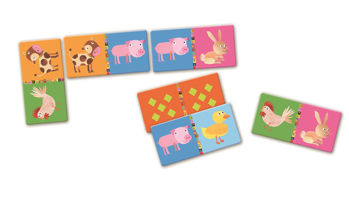 Gra dla dzieci domino. Prostokąty ( 28 elementów o wymiarach 10 x 5 cm ) z rysunkami zwierząt mieszkających na farmie z jednej strony, a z drugiej kropki do liczenia, należy ze sobą połączyć. Walory edukacyjne: nauka spostrzegawczości, koncentracji.
