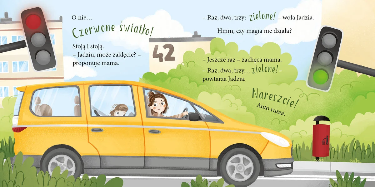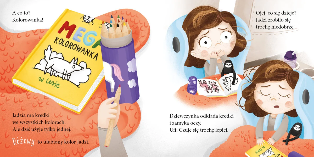 Jadzia Pętelka podróżuje z rodziną autem. Siedzi wygodnie w foteliku, ale droga trochę się dłuży, a widok za oknem nie zawsze jest ciekawy. Nawet leniwiec Jadzi zaczyna się nudzić, więc mama wymyśla różne zabawy.