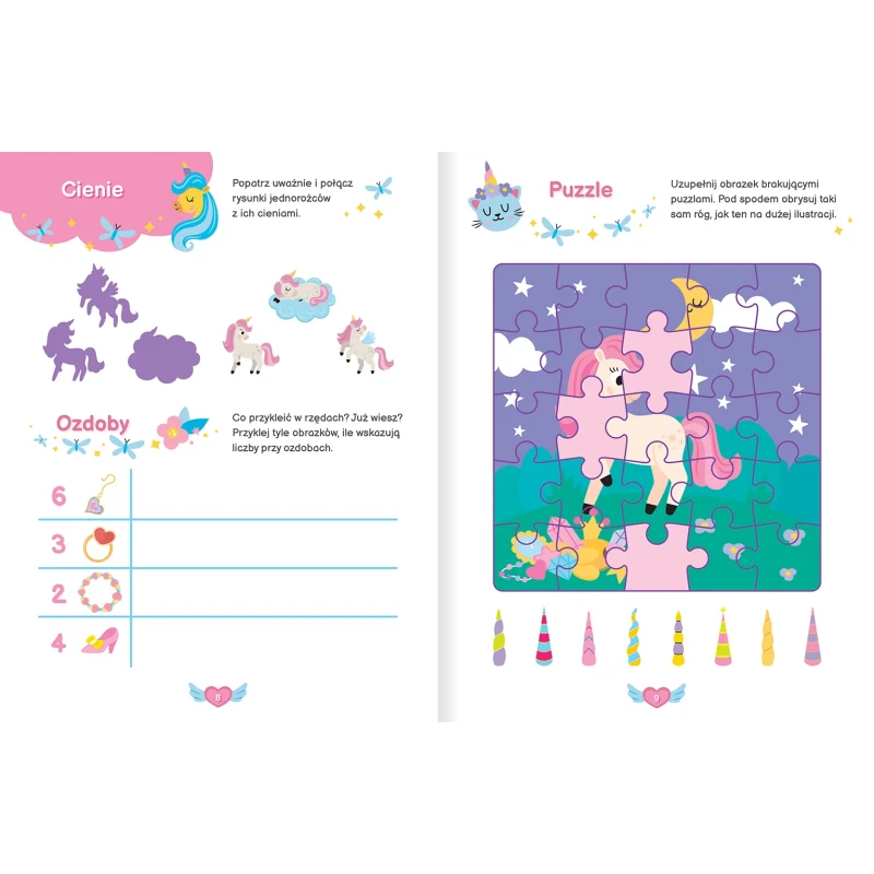 Jednorożce zapraszają do świata zadań z naklejkami. Ciekawe i starannie opracowane łamigłówki z naklejkami rozwijają spostrzegawczość, w naturalny sposób zachęcają do nauki liczenia, uczą skupienia i koncentracji uwagi. Dzieci bardzo lubią takie aktywizujące zadania. Znajdą tu klasyczne labirynty, wyszukiwanie różnic, łączenie punktów, ukryte rysunki, logiczne sekwencje i obrazkowe sudoku oraz ćwiczenia manualne w rysowaniu po śladzie. Dodatkowe naklejki 3D można wykorzystać w książce lub poza nią.