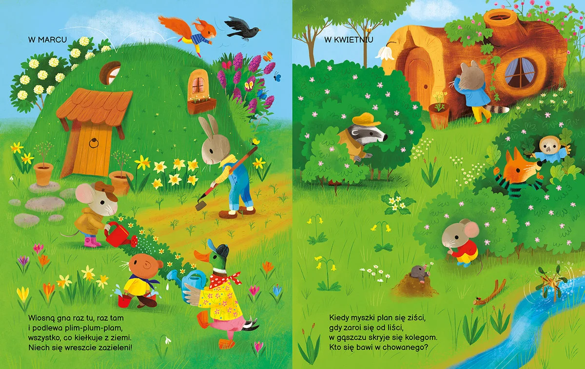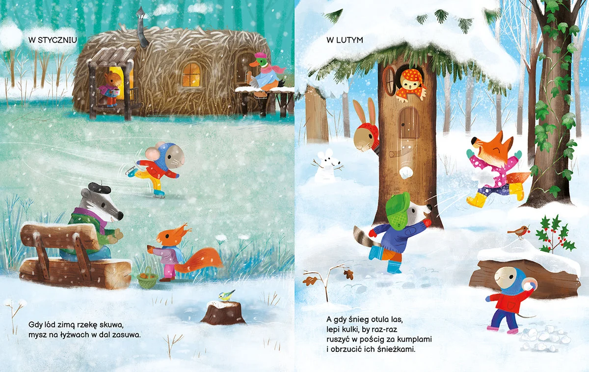 Pełne szczegółów i humoru, całostronicowe ilustracje poprowadzą małego czytelnika przez kolejne miesiące roku. Zobaczy, jak sympatyczna bohaterka bawi się w chowanego między kwitnącymi krzewami, kąpie w chłodnym jeziorze, skacze w kaloszach po kałuży i bierze udział w bitwie na śnieżki.