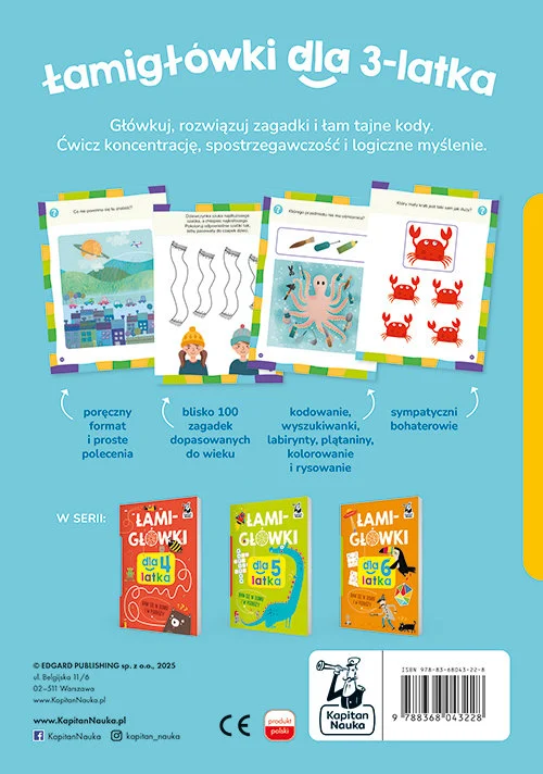 Łamigłówki dla 3-latka zapewnią dzieciom długie godziny dobrej zabawy. Zagadki pomogą doskonalić zarówno umiejętność porządkowania wydarzeń w czasie i łączenia ich w związki przyczynowo-skutkowe, jak i umiejętność wskazywania różnic i podobieństw. Proste zabawy grafomotoryczne i kolorowanki rozwiną sprawność dłoni. Zadaniom towarzyszą sympatyczni bohaterowie. Barwne ilustracje przyciągają uwagę 3-latków i zachęcają do rozwiązywania zadań.