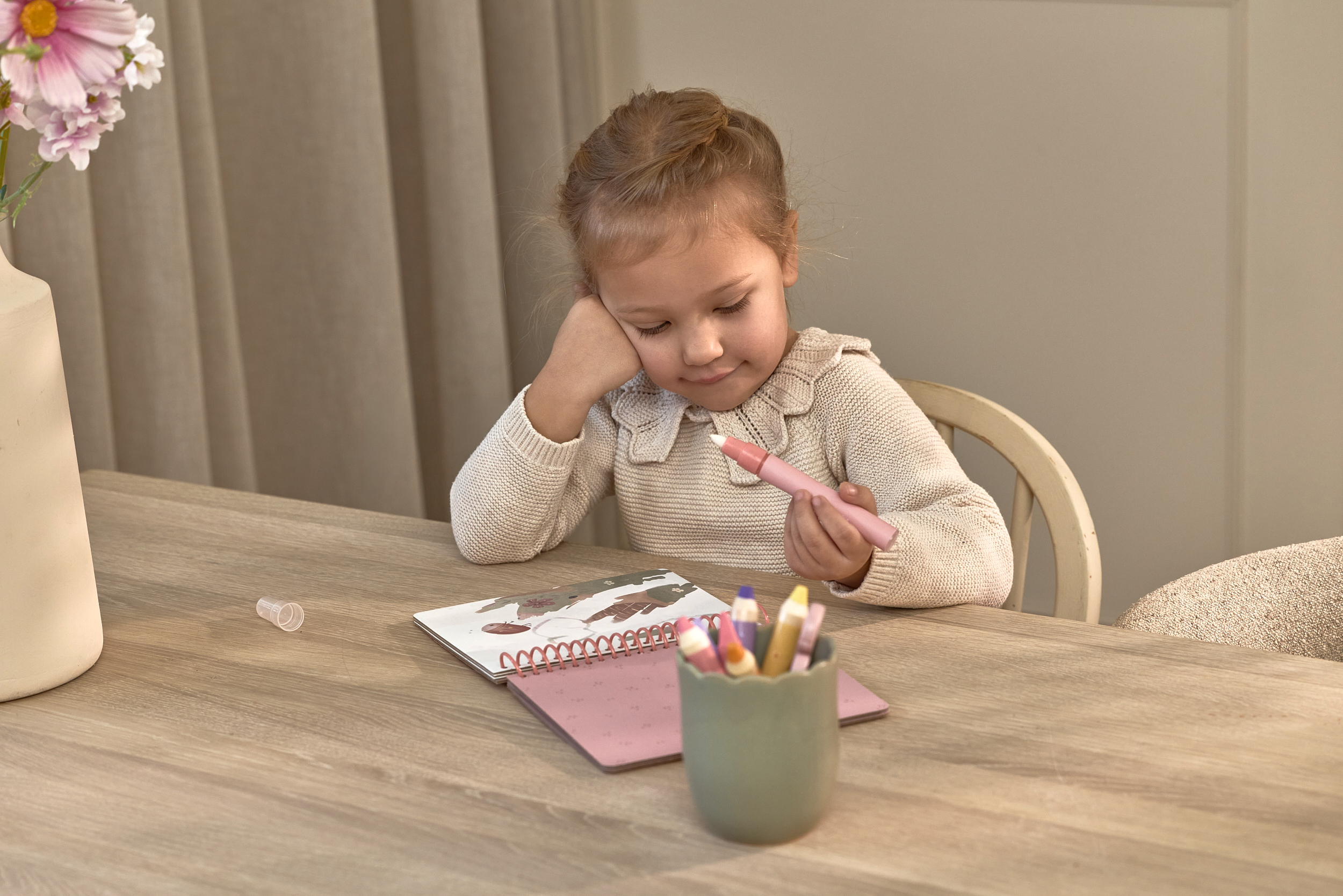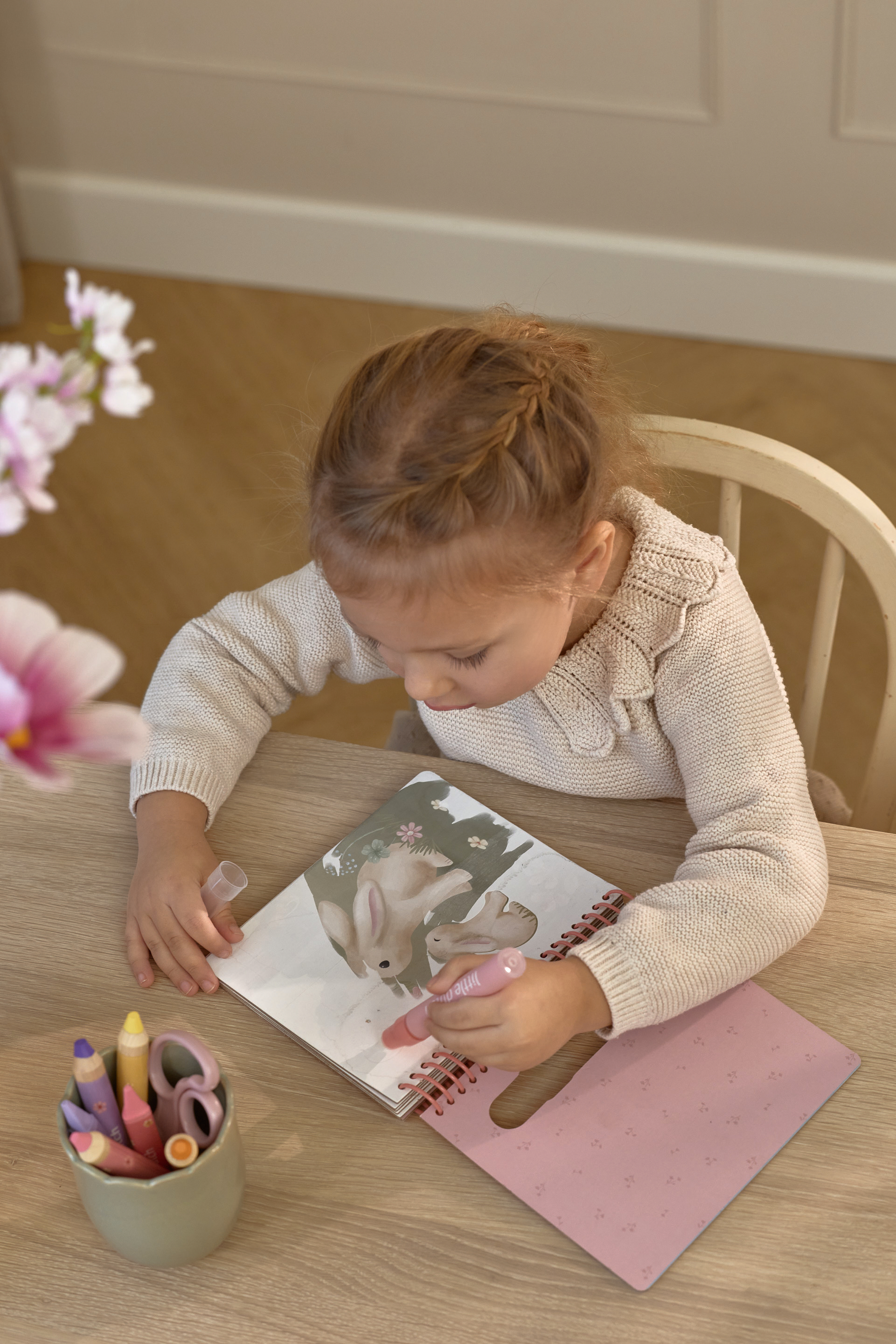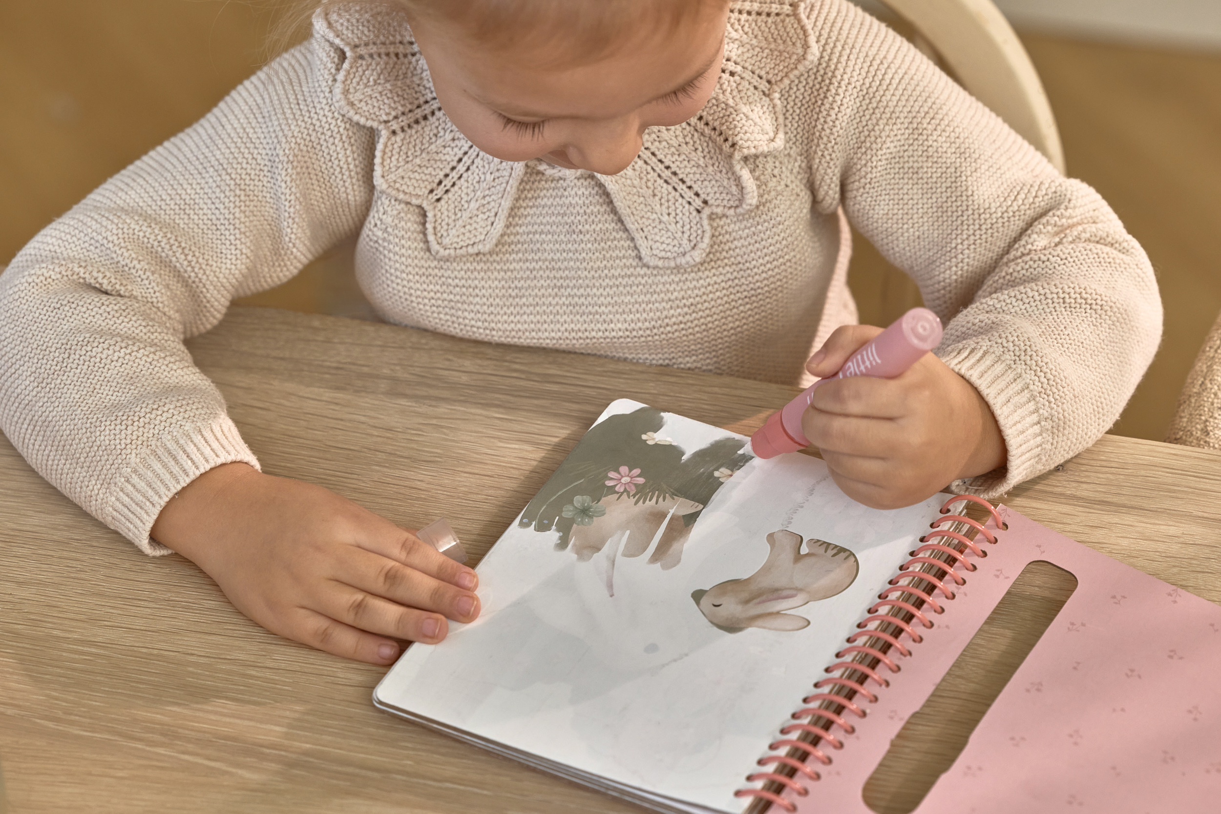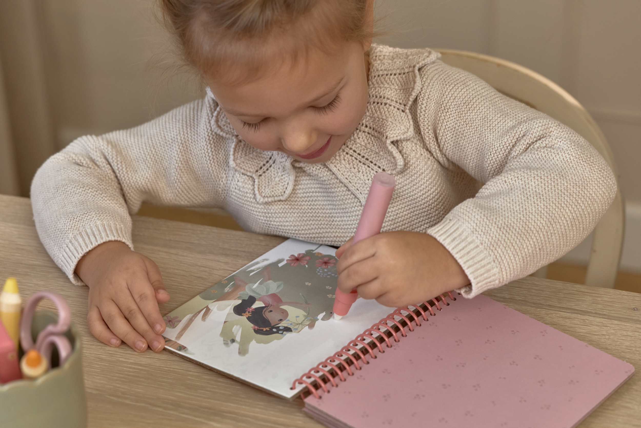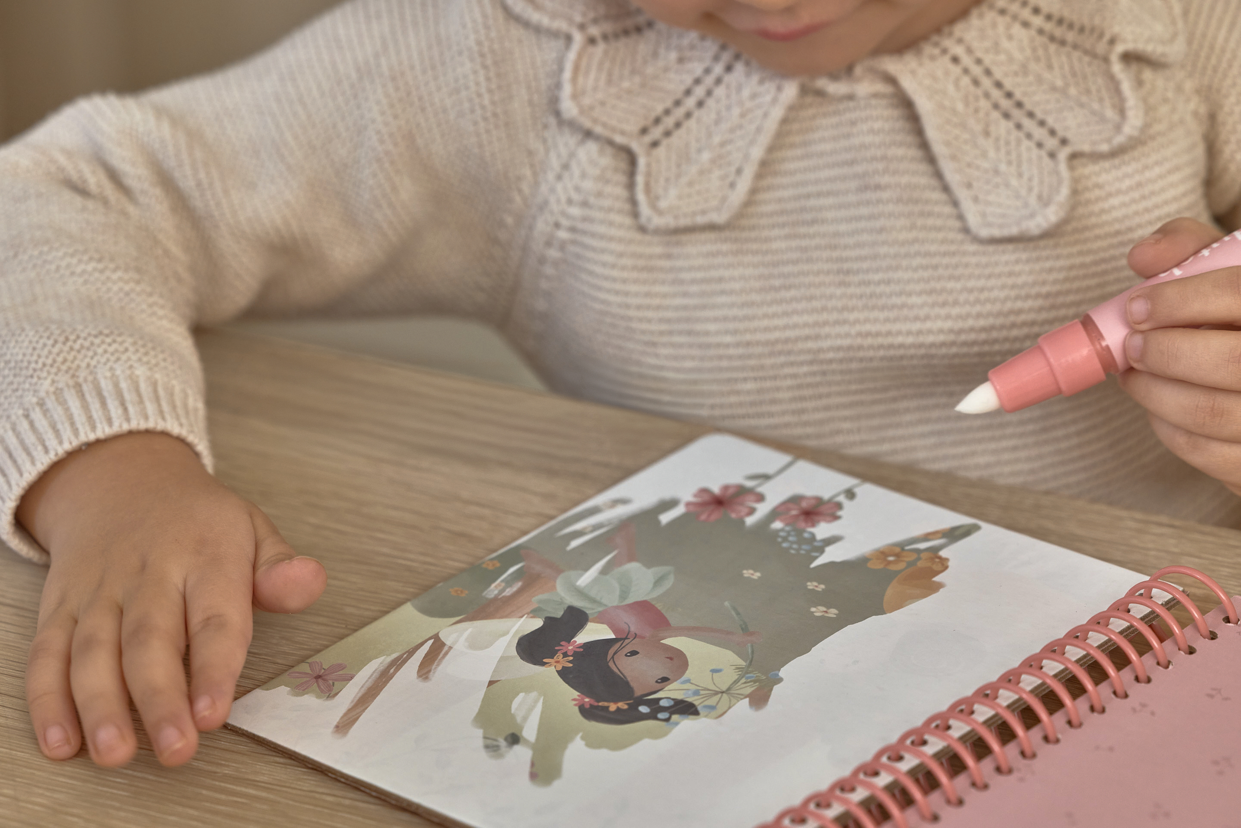 Kolorowanka wodna Rosa & Friends z kolekcji Fairy Garden Little Dutch. Pozwól dziecku zanurzyć się w magicznym świecie kolorowanek wodnych. Wystarczy napełnić specjalne pióro wodą, by wspólnie odkrywać, jak białe strony w jednej chwili ożywają feerią barw, tworząc zachwycające, pełne detali sceny. Solidne, grube kartki oraz wygodny segregator na kółka sprawiają, że książeczka doskonale leży w małych rączkach i wytrzymuje wielokrotne użycie. To idealny sposób na kreatywną, czystą i angażującą zabawę, do której dziecko będzie chętnie wracać.
