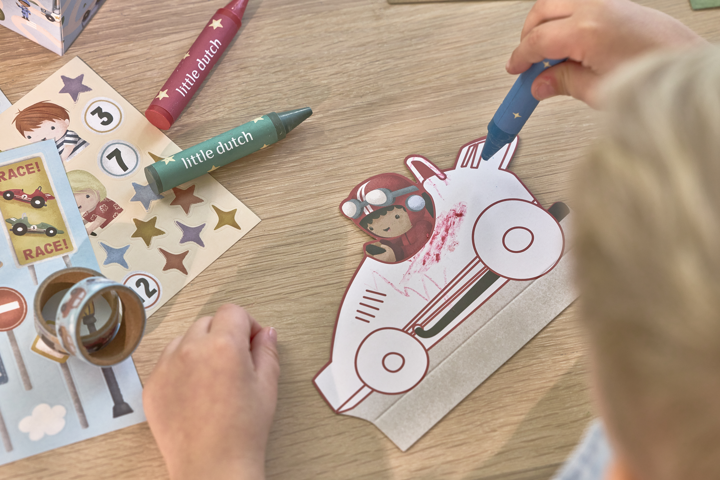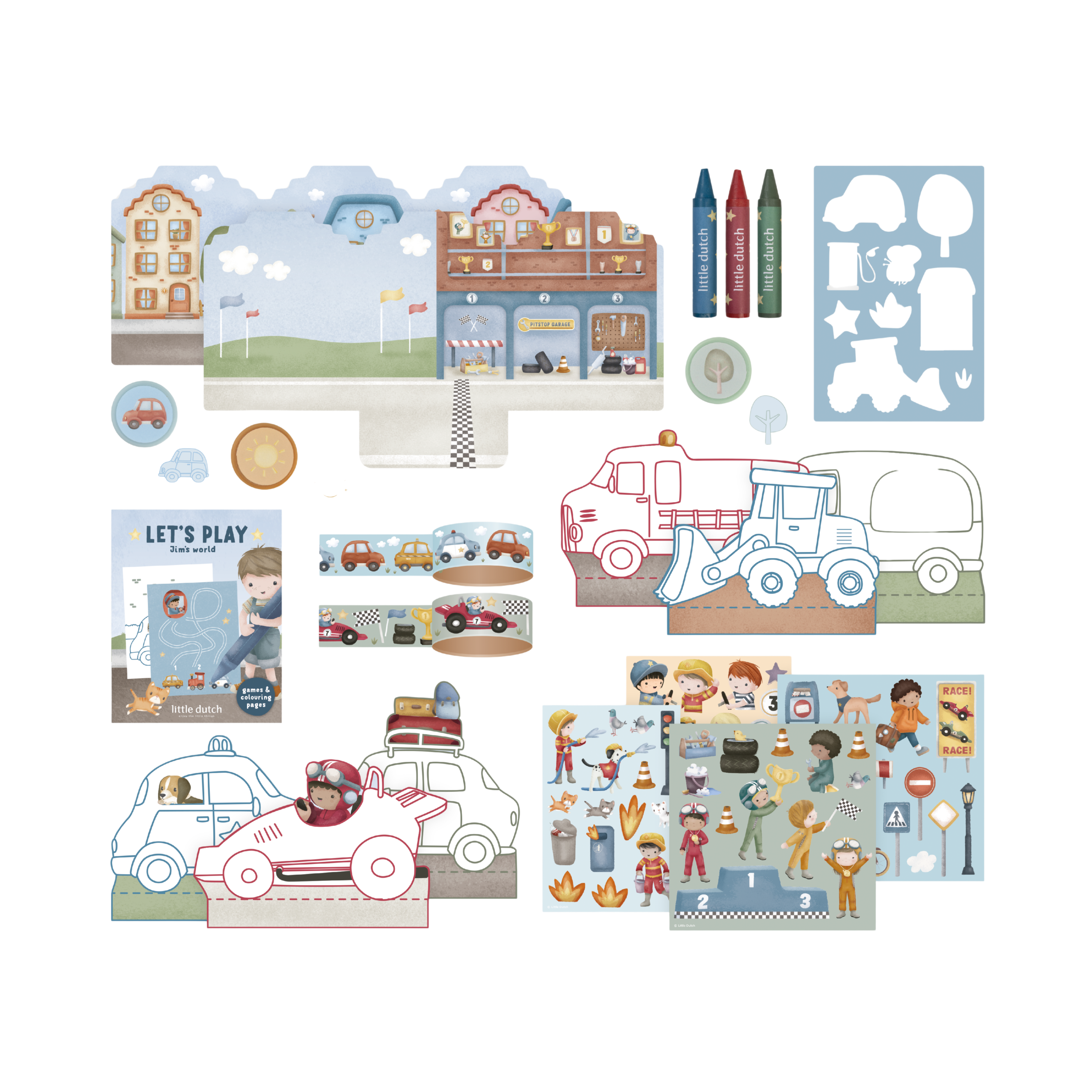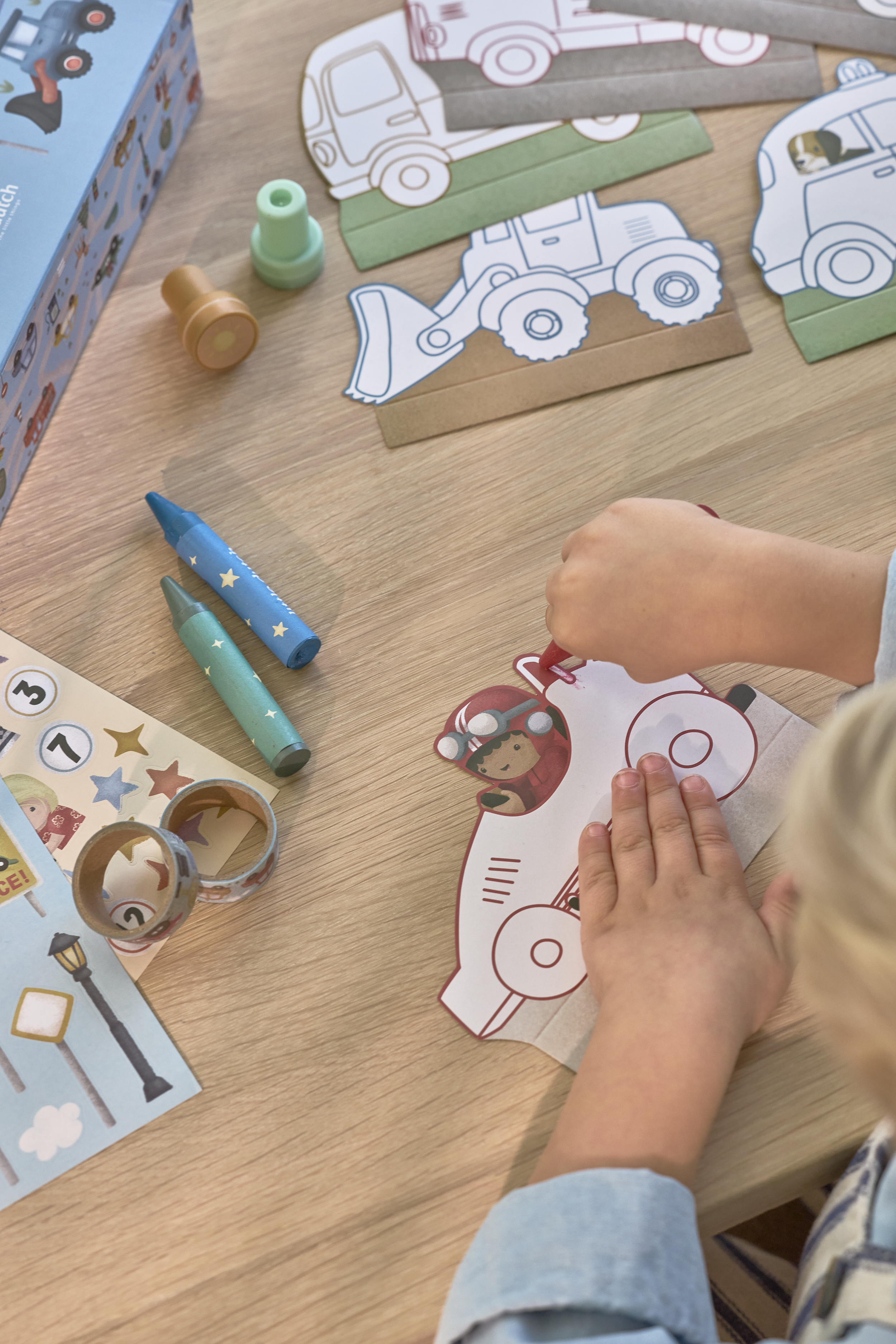 Zestaw zawiera: kolorowe kartonowe arkusze z motywem samochodów, ciężarówek, wyścigówek, a także naklejki, stempelki, kredki, taśmy kolorowe, papierowe dodatki do odgrywania scenek, książeczkę z zadaniami i kolorowanką. Wszystko zapakowane w piękną ozdobną walizeczkę.