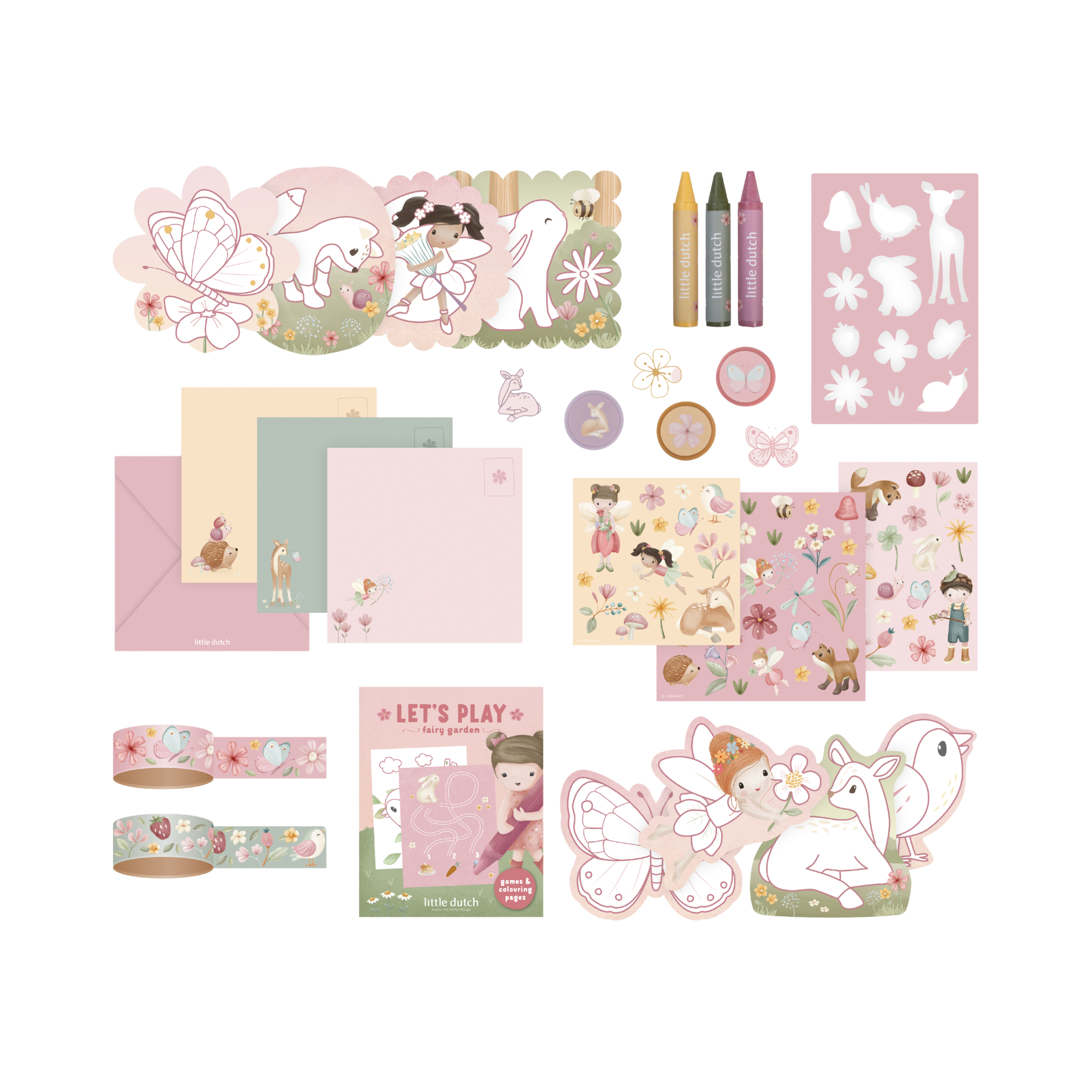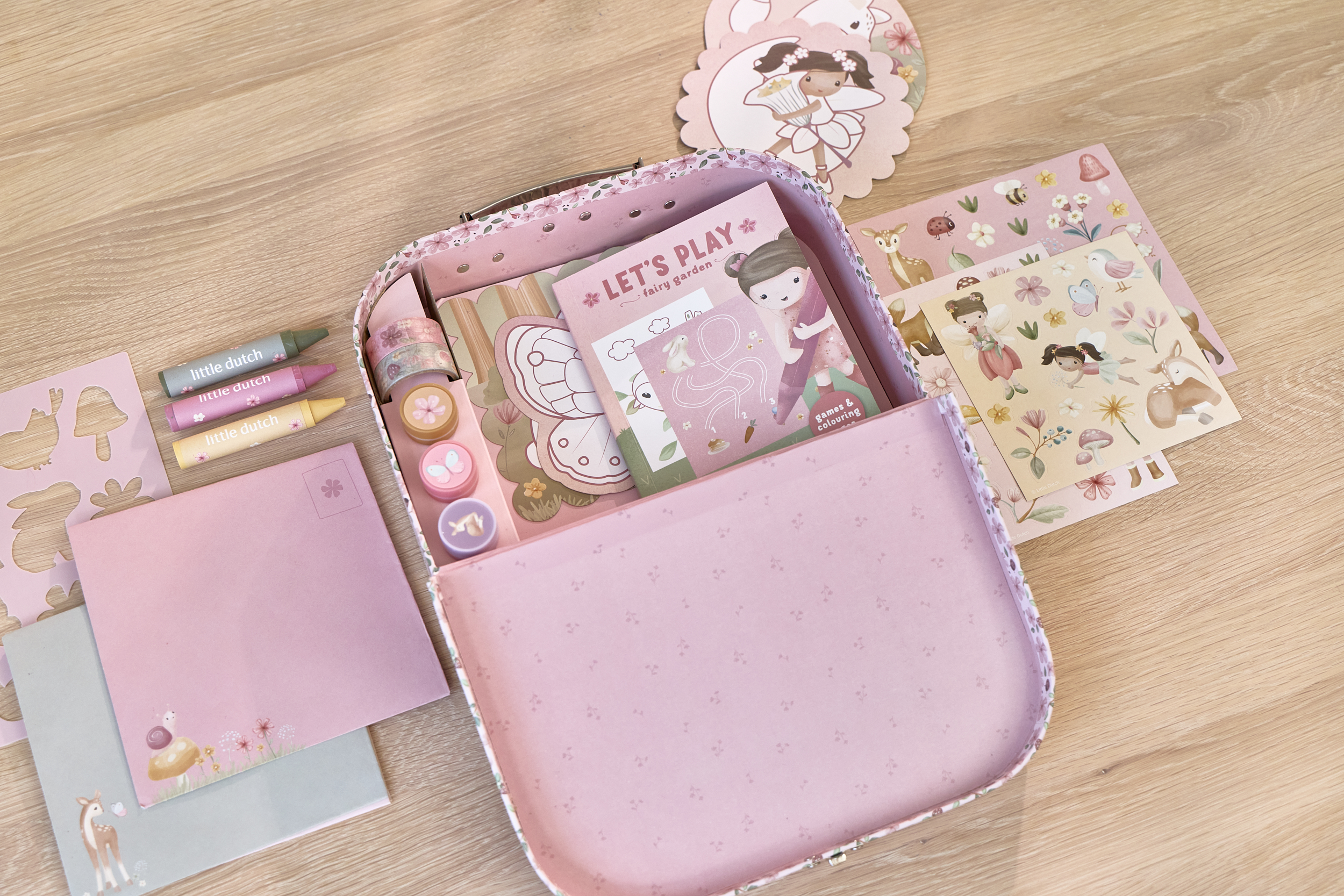 Zestaw zawiera: kolorowe kartki oraz arkusze papieru z motywem wróżek, kwiatów, motyli i leśnych zwierzątek, naklejki, kredki świecowe, taśmy dekoracyjne, wycinanki, koperty oraz książeczkę z zadaniami oraz kolorowanką. Wszystko zapakowane w piękną ozdobną walizeczkę.