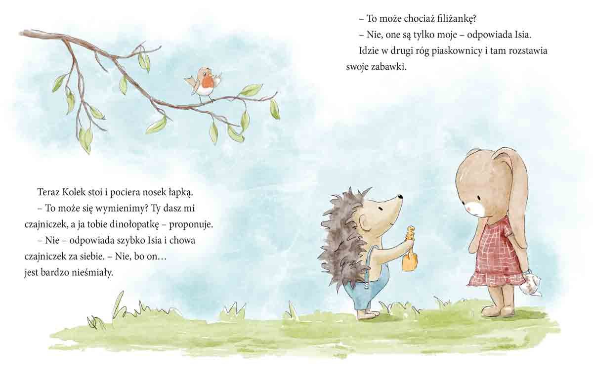 Isia uwielbia spędzać czas ze swoim przyjacielem Kolkiem. Ale kiedy jeżyk chce pożyczyć jej ulubione zabawki, wychodzi na to, że dzielenie się nie jest wcale takie łatwe! Króliczka zgadza się pobawić z Kolkiem czajniczkiem i filiżankami, ale ukochaną lalką? To już całkiem inna historia! Z pomocą mamy uda się jednak znaleźć idealne rozwiązanie.