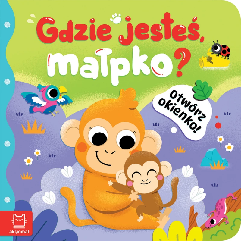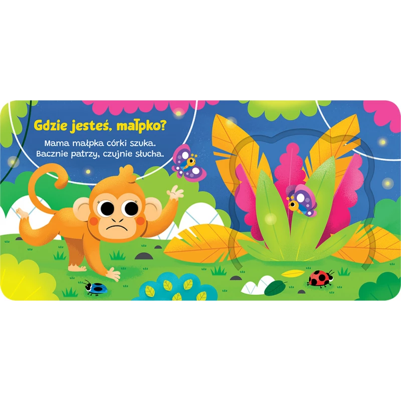 Zabawa tą książką polega na otwieraniu okienek, w których kryją się egzotyczne zwierzęta: papuga, tygrys, krokodyl, wąż i mała małpka, której w dżungli szuka mama małpka. Na każdej rozkładówce znajduje się krótki wierszyk o szukaniu małpki przez zmartwioną mamę – wierszowany tekst łatwo zapada w pamięć i po kilku godzinach zabawy dziecko będzie znało wierszyki, dzięki czemu ćwiczy pamięć i wzbogaca swoje słownictwo. Książeczka z okienkami to doskonała zabawa dla każdego dziecka.