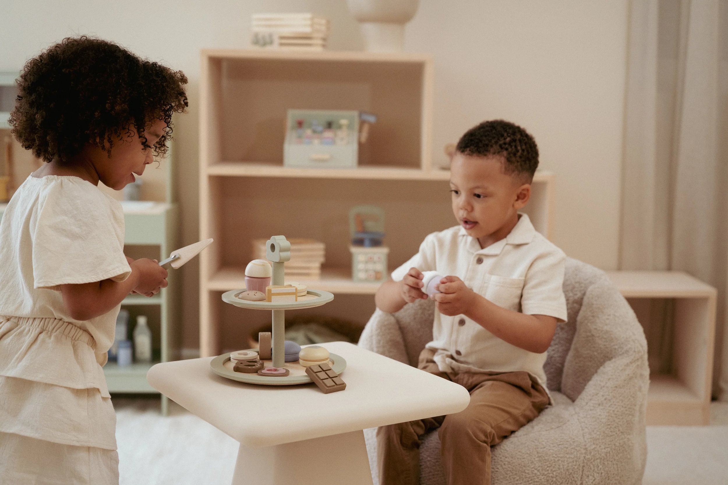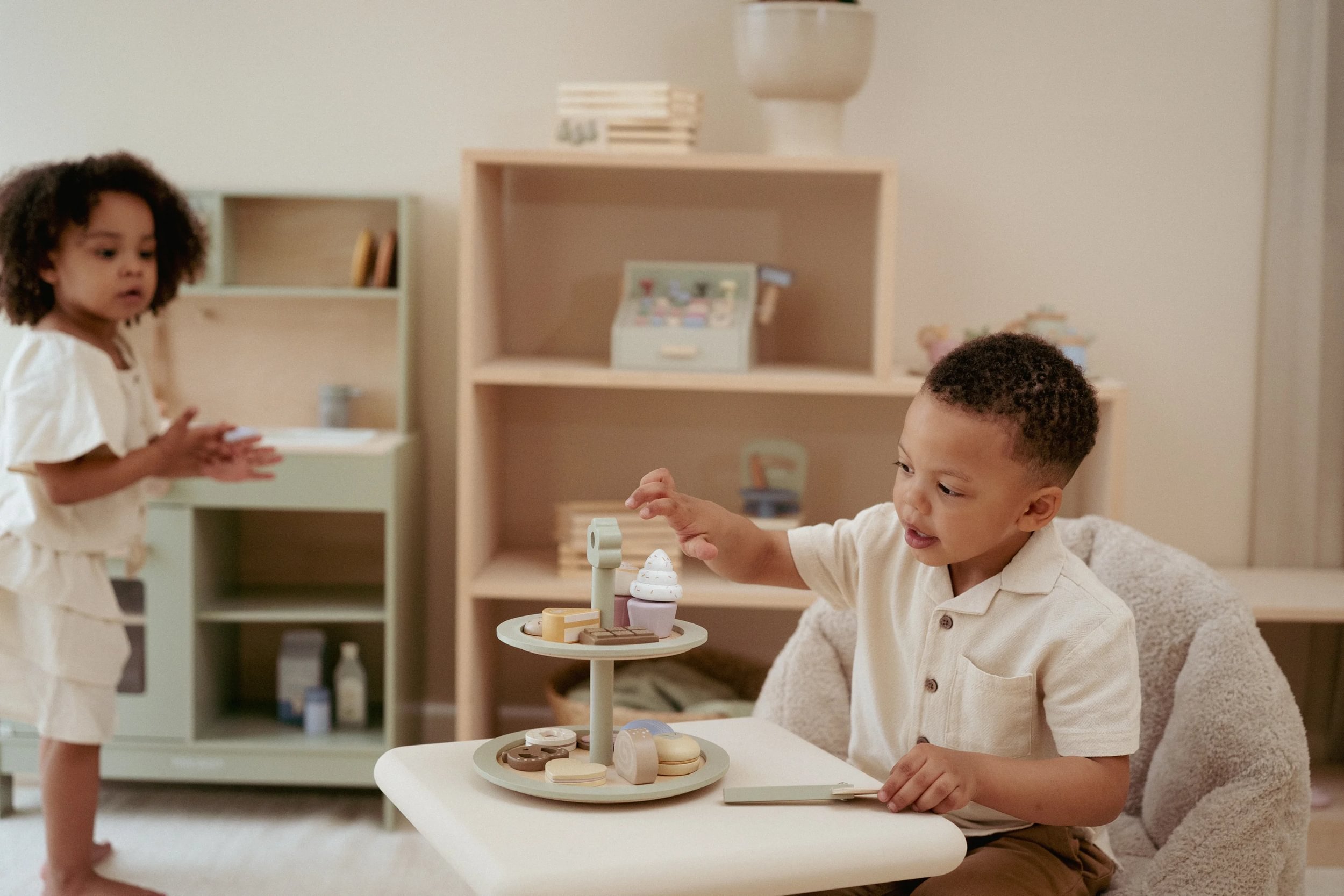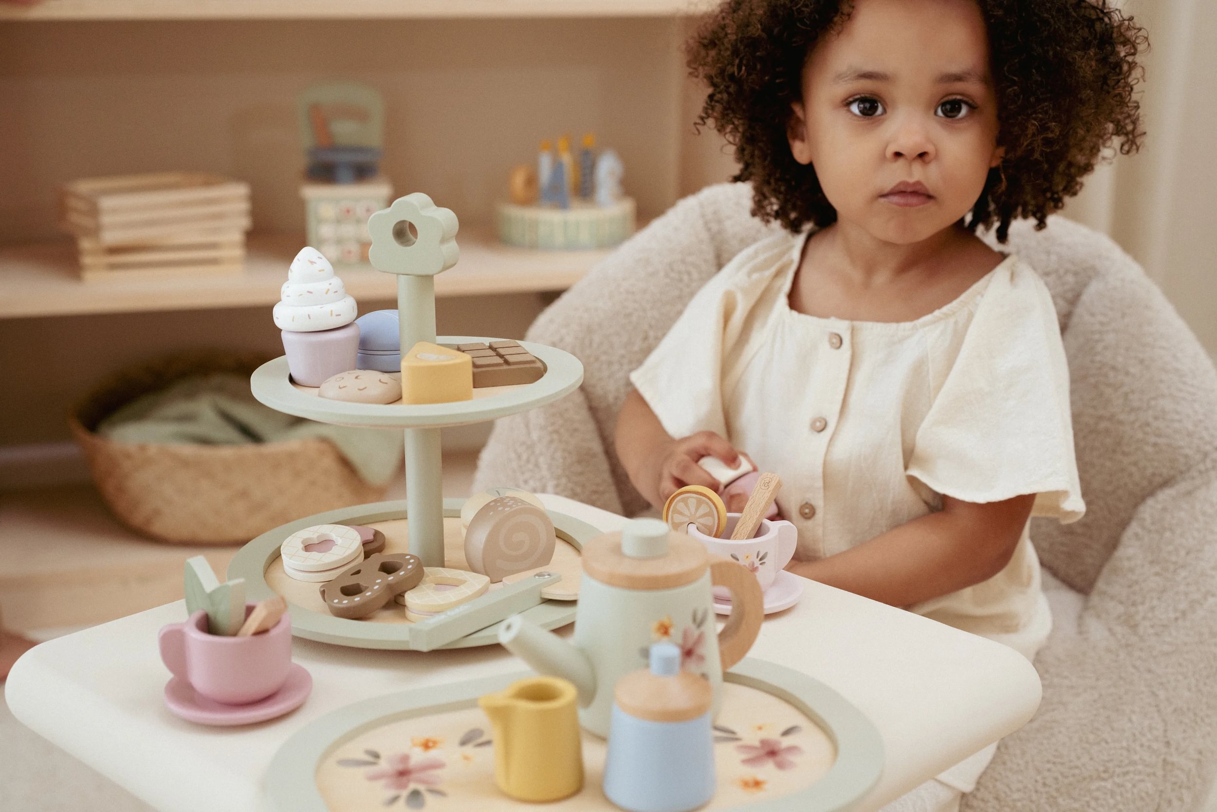 Piętrowa, drewniana patera na słodkości od Little Dutch. W zestawie znajdują się różnego rodzaju ciasteczka, szpatułka do ciasta oraz papierowe menu.