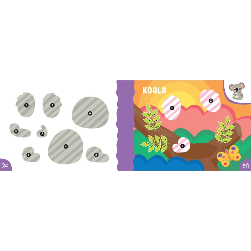 5. Poproś dziecko, by ułożyło wycięte elementy na stronie do naklejania i przykleiło je klejem.