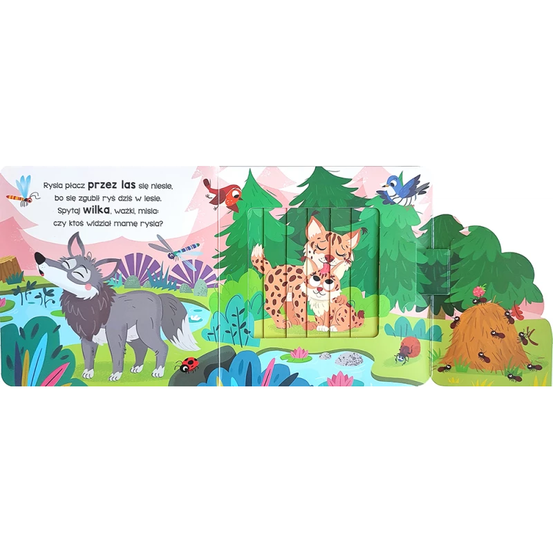 Uwaga! Magia! Wystarczy otworzyć okładkę lub pociągnąć za zakładkę, a jeden obrazek zmienia się w inny. Dzieci będą zachwycone tą książeczką, w której za pomocą prostego mechanizmu można ożywić zwierzątka w lesie.