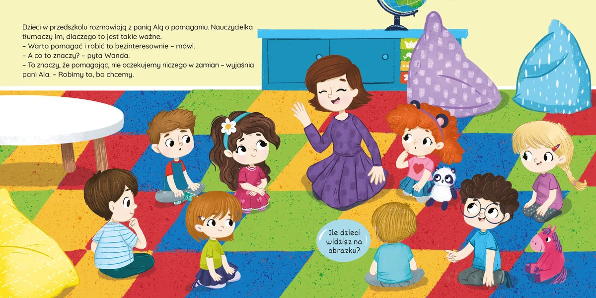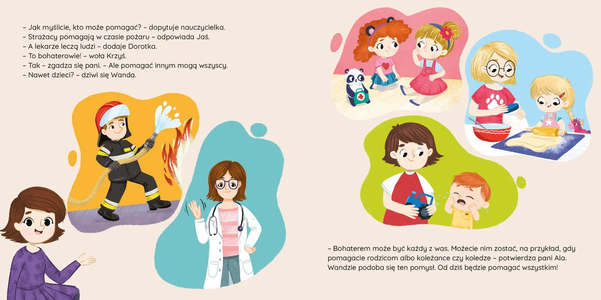 Wanda dowiaduje się, że pomaganie to coś więcej niż tylko praca strażaka czy lekarza. To także drobne gesty, ciepłe słowa i uważność na innych. W codziennym życiu każdy z nas może zrobić coś dobrego – wystarczy tylko chcieć!