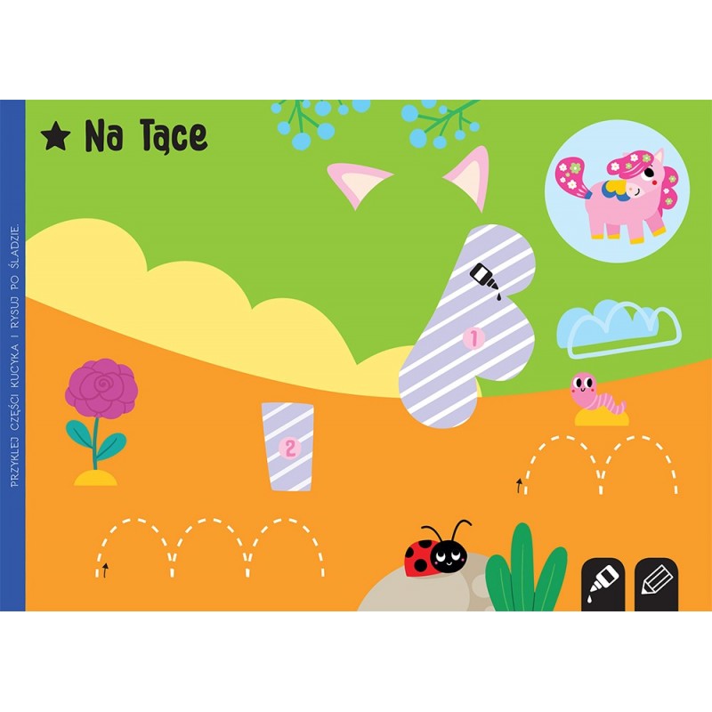 to aktywizująca książka dla przedszkolaków. Jak z niej korzystać? Dziecko wycina proste elementy i przykleja w odpowiedniej kolejności tak, by powstał obrazek, a całość kompozycji dopełnia, rysując po linii przerywanej. Perforacja w książce ułatwia wyrywanie kart i wycinanie. W książeczce znajduje się 10 koników do wycięcia i 10 teł do wyklejenia. Powstałe obrazki są estetyczne, rozpoznawalne i naprawdę dostarczają dziecku sporo radości oraz satysfakcji z samodzielnego wycinania. W książce do wycięcia są: pegazy, kucyki, jednorożce, źrebak na łące oraz magiczne konie z Egiptu, dalekiej północy i wypoczywające na hamaku w ciepłych krajach. „Wycinam, naklejam, rysuję. Kucyki. Wycinanki edukacyjne” to okazja do nabywania niezbędnych i praktycznych umiejętności manualnych. Książeczka rozwija sprawność małych paluszków i uczy samodzielności.