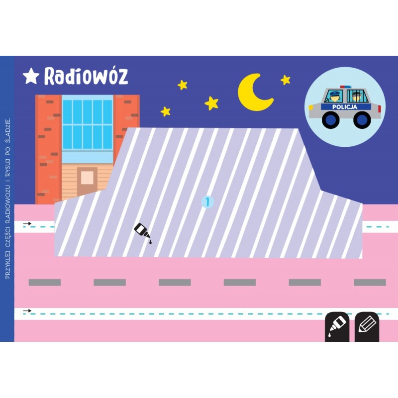 Jak z niej korzystać? Dziecko wycina proste elementy i przykleja w odpowiedniej kolejności tak, by powstał obrazek, a całość kompozycji dopełnia, rysując po linii przerywanej. Perforacja w książce ułatwia wyrywanie kart i wycinanie.