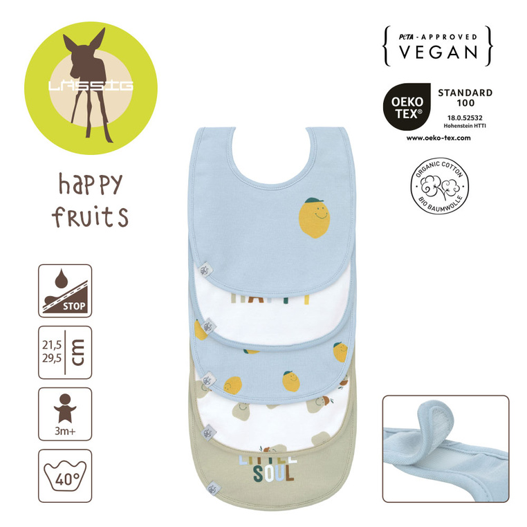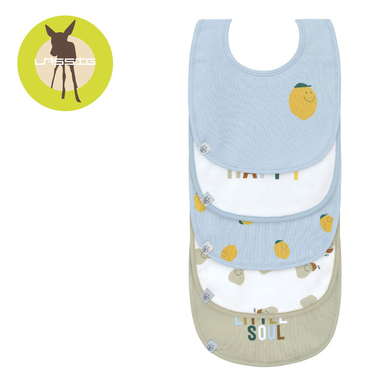 Zestaw pięciu miękkich, bawełnianych śliniaków niemieckiej marki LASSIG. Każdy inny: dwa jasnoniebieskie z motywem uśmiechniętej cytrynki, szary z napisem HAPPY LITTLE SOUL, biały z motywem uśmiechniętej gruszki oraz biały z kolorowym napisem HAPPY. Wodoodporne, bezpieczne, przydatne przy karmieniu oraz pierwszych samodzielnych posiłkach. Zapięcie na rzep zapewnia komfort użytkowania. Stanowią część większej kolekcji Happy Fruits. Możesz dobrać do nich inny produkt w tej samej gamie kolorystycznej lub z tym samym motywem.