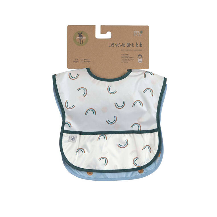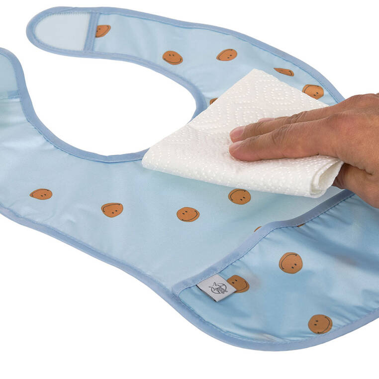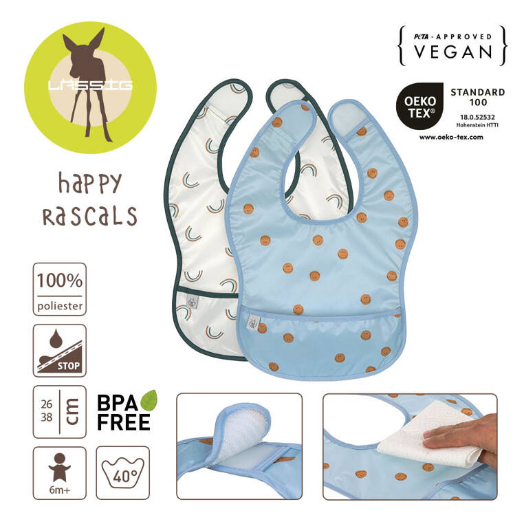 Zestaw dwóch praktycznych, łatwo zmywalnych śliniaków niemieckiej marki LASSIG. Są duże, wykonane z wodoodpornego tworzywa – jeden jasnoniebieski w karmelowe uśmiechnięte buźki, drugi jasny z ciemnozielonym obszyciem w multiprint z tęczą. Miękka taśma i zapięcie na rzep zapewniają komfort użytkowania. Śliniaki przeznaczone są dla dzieci od 6. do 24. miesiąca życia. Sprawdzą się przy płynnych czy szczególnie brudzących posiłkach, przy karmieniu, jak i pierwszych próbach samodzielnego jedzenia. Na dole mają kieszonkę, gdzie mogą się zbierać resztki pokarmu, które nie trafiły do buzi. Dzięki temu masz pewność, że nie zaplamią ubrania maluszka. Stanowią część większej kolekcji Happy Rascals. Możesz dobrać do nich inny produkt w tej samej gamie kolorystycznej.
